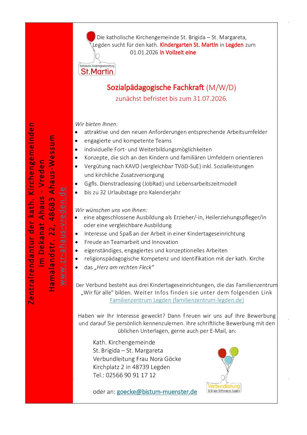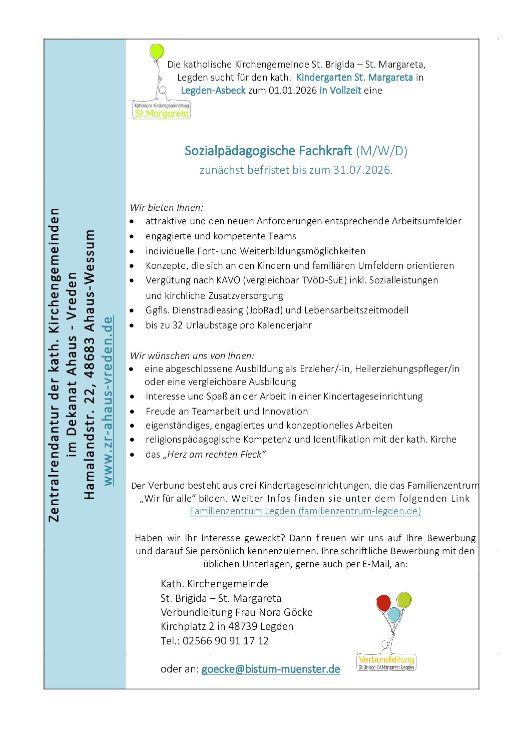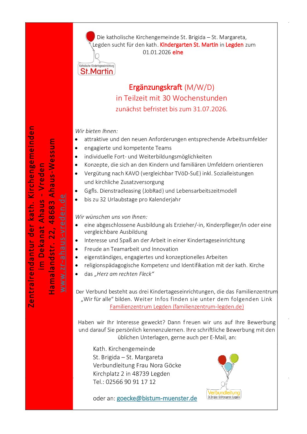 Das Familienzentrum freut sich, dich für uns zu begeistern und als Teil unseres Teams zu begrüßen. Rufe uns an oder schicke Deine Bewerbung an goecke@bistum-muenster.de.